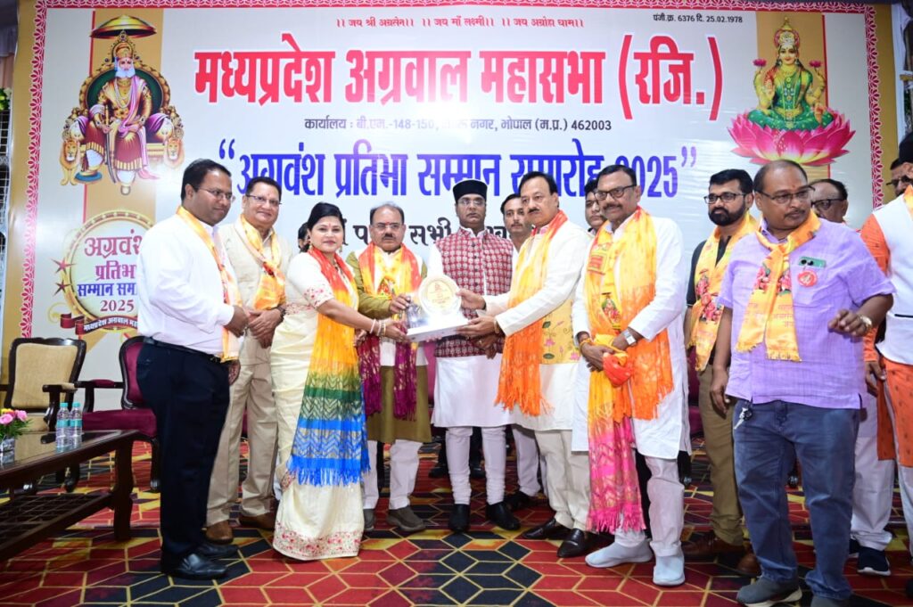 सीएनएन सेंट्रल न्यूज़ एंड नेटवर्क–आईटीडीसी इंडिया ईप्रेस / आईटीडीसी न्यूज़ भोपाल : मध्यप्रदेश अग्रवाल महासभा (रजि.) द्वारा हिंदी भवन, भोपाल में अग्रवंश प्रतिभा सम्मान समारोह 2025 का भव्य आयोजन किया गया। इस गरिमामय कार्यक्रम में प्रदेशभर से चयनित 300 से अधिक मेधावी छात्र-छात्राओं को मोमेंटो और प्रमाण पत्र प्रदान कर सम्मानित किया गया।