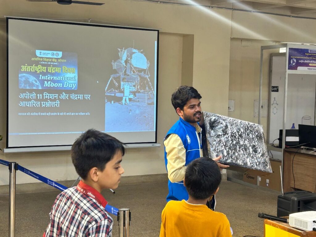 सीएनएन सेंट्रल न्यूज़ एंड नेटवर्क – आईटीडीसी इंडिया ईप्रेस / आईटीडीसी न्यूज़ भोपाल : मानव इतिहास की सबसे अद्भुत उपलब्धियों में से एक को चिह्नित करते हुए, आंचलिक विज्ञान केंद्र, भोपाल द्वारा अंतरराष्ट्रीय चंद्रमा दिवस मनाया गया । यह आयोजन विद्यार्थियों और आम दर्शकों के लिए प्रेरणादायक व शैक्षणिक गतिविधियों से भरपूर रहा । 16 जुलाई 1969 को नासा का अपोलो-11 यान केनेडी स्पेस सेंटर से लॉन्च हुआ। केवल चार दिन बाद, 20 जुलाई 1969 को नील आर्मस्ट्रांग ने चंद्रमा पर पहला कदम रखा, उनके पीछे बज़ एल्ड्रिन भी उतरे, जबकि माइकल कॉलिंस यान की कक्षा में परिक्रमा कर रहे थे।