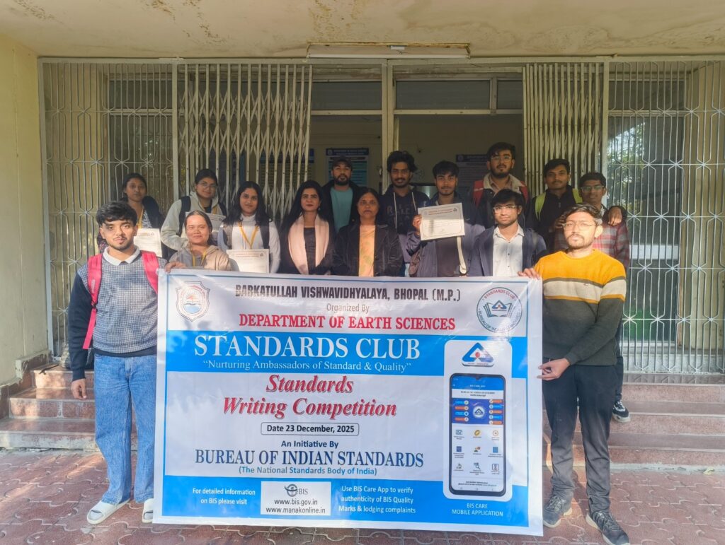 रिसोर्स पर्सन दीपिका गायकवाड एवं भूविज्ञान विभाग के स्टैण्डर्ड क्लब की मेंटर डॉ. विनीशा सिंह ने भारतीय मानक ब्यूरो और मानक लेखन प्रतियोगिता के बारे में मार्गदर्शन दिया तथा दैनिक जीवन की वस्तुओं में बी.आई.एस. के हॉलमार्क और उसके महत्व के बारे में बताया। इसके बाद छात्र-छात्राओं ने पैकेज्ड ड्रिंकिंग वाटर विषय पर मानक लेखन किया और मानक लेखन प्रतियोगिता में प्रथम स्थान पर अंकिता सिंह ठाकुर -आशी ताम्रकार, द्वितीय स्थान पर शोभित दाहिया-मौतासिम बिल्लाह , तृतीय स्थान पर मौमिता जाना-तुलसी मरावी और चतुर्थ (सांत्वना) पुरस्कार हेतु आर्यन राय का समूह रहा जिन्हें पुरुष्कृत किया गया। यह कार्यक्रम डॉ. विनीशा सिंह, मेंटर एवं विभागाध्यक्ष,भूविज्ञान विभाग,बरकतउल्ला