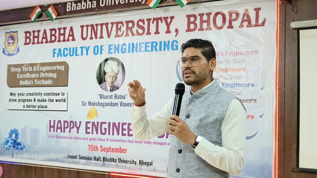 सीएनएन सेंट्रल न्यूज़ एंड नेटवर्क – आईटीडीसी इंडिया ईप्रेस / आईटीडीसी न्यूज़ भोपाल: भाभा विश्वविद्यालय में भारत रत्न सर मोक्षगुंडम विश्वेश्वरैया के जन्म दिवस पर अभियंता दिवस का भव्य आयोजन किया गया। इस कार्यक्रम में मुख्य अतिथि इंजीनियर वैभव यादव उप महाप्रबंधक उच्च दाब अनुरक्षण प्रभाग,भोपाल शहर एवं इंजीनियर हर्षित तिवारी सब डिविजनल ऑफिसर, पब्लिक हेल्थ इंजीनियरिंग डिपार्टमेंट सीहोर ,मध्य प्रदेश मुख्य रूप से शामिल हुए। कार्यक्रम की शुरुआत मां सरस्वती वंदना एवं द्वीप प्रज्वलन के साथ हुई विश्वविद्यालय के कुलगुरु डॉक्टर दिलीप कुमार डे द्वारा अतिथियों का सम्मान पुष्प गुच्छ , शॉल श्रीफल के साथ किया गया ।इस अवसर पर कुलगुरु डॉक्टर दिलीप कुमार डे द्वारा सर मोक्षगुंडम विश्वेश्वरैया के कार्यों पर प्रकाश डाला गया।