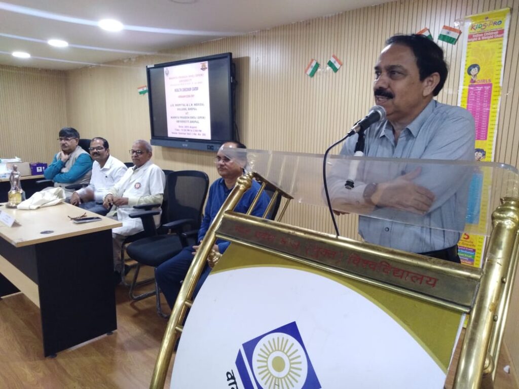 उन्होंने कहा कि, एक समय था, जब मोटापा खाते पीते घरों की निशानी मानी जाती थी। किंतु आज ऐसा नहीं है, मोटापा आज खराब स्वास्थ्य के निशानी मानी जाती है। उन्होंने कहा कि, उच्च रक्तचाप से लोगों के मस्तिष्क में स्ट्रोक हो सकता है तथा हार्ट भी फेल हो सकता है। इसलिए हमें अपने दिनचर्या को सुधारने की जरूरत है। कार्यक्रम में धन्यवाद ज्ञापित करते हुए मध्य प्रदेश भोज मुक्त विश्वविद्यालय के निर्देशक रतन सूर्यवंशी ने कहा कि, आज हमारे सामने सबसे बड़ी चुनौती है कि, कम खर्चे में हम आम लोगों तक कैसे स्वास्थ्य सेवाएं पहुंचाएं। उन्होंने शिविर में आए डॉक्टरों का आवाहन करते हुए है कि, आप अपने जीवन में सुनिश्चित करें की किस प्रकार गरीब लोगों को उचित कीमत पर स्वास्थ्य सुविधा मिल सके। कार्यक्रम में स्वागत भाषण आंतरिक गुणवत्ता एवं आश्वासन केंद्र के प्रभारी निदेशक नरेंद्र त्रिपाठी द्वारा दिया गया तथा कार्यक्रम का संचालन विश्वविद्यालय की वरिष्ठ सलाहकार निधि रावल गौतम द्वारा किया गया। इस अवसर पर विश्वविद्यालय के कर्मचारी, अधिकारी, शिक्षक एवं विद्यार्थीगण उपस्थित रहे।