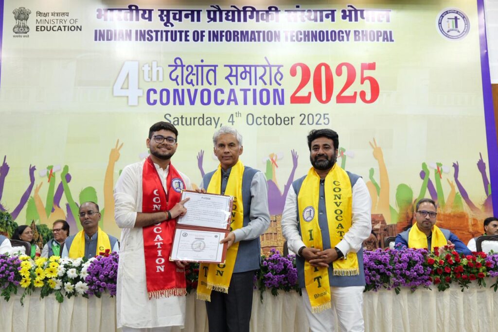 सीएनएन सेंट्रल न्यूज़ एंड नेटवर्क–आईटीडीसी इंडिया ईप्रेस /आईटीडीसी न्यूज़ भोपाल : डिजिटल स्मारिका का QR स्कैन कर किया विमोचन। इस महीने की 4 तारीख को भारतीय सूचना प्रौद्योगिकी संस्थान भोपाल का चौथा डिग्री वितरण समारोह (दीक्षांत समारोह) सिविल सभागार में हुआ। इस कार्यक्रम में साल 2025 में कंप्यूटर विज्ञान, इन्फॉर्मेशन टेक्नोलॉजी और इलेक्ट्रॉनिक्स एवं कम्युनिकेशन इंजीनियरिंग के 182 छात्रों को बीटेक की डिग्री दी गई। जिसमें 47 छात्र ईसीई के, 66 छात्र आईटी के और 69 छात्र सीएसई के रहे।