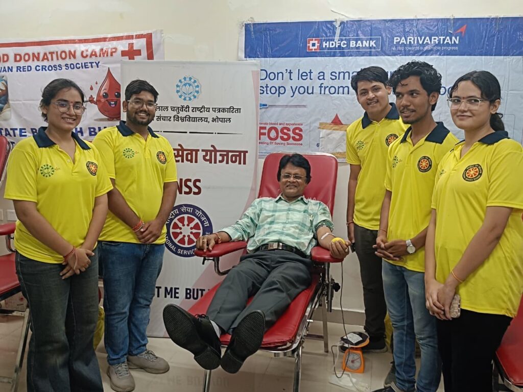 सीएनएन सेंट्रल न्यूज़ एंड नेटवर्क – आईटीडीसी इंडिया ईप्रेस / आईटीडीसी न्यूज़ भोपाल : माखनलाल चतुर्वेदी राष्ट्रीय पत्रकारिता एवं संचार विश्वविद्यालय भोपाल के धन्वंतरि चिकित्सालय में राष्ट्रीय सेवा योजना (एनएसएस), एचडीएफसी बैंक एवं रेड क्रॉस हॉस्पिटल के संयुक्त तत्वावधान में रक्तदान शिविर का आयोजन किया गया। रक्तदान शिविर का शुभारंभ विश्वविद्यालय के कुलगुरु विजय मनोहर तिवारी ने किया। इस अवसर पर उन्होंने सबसे पहले रक्तदान कर विद्यार्थियों को प्रेरित किया। कार्यक्रम में विश्वविद्यालय के विद्यार्थियों एवं शिक्षकों ने बढ़.चढ़कर हिस्सा लिया। इस दौरान कुल 50 यूनिट रक्त एकत्रित किया गया, जबकि मात्र 12 लोग ही रक्तदान नहीं कर सके।पिछली बार की अपेक्षा इस बार अधिक संख्या में छात्राओं ने रक्तदान कर विशेष योगदान दिया। इस बार बड़ी संख्या में छात्राओं ने सफलतापूर्वक रक्तदान किया।