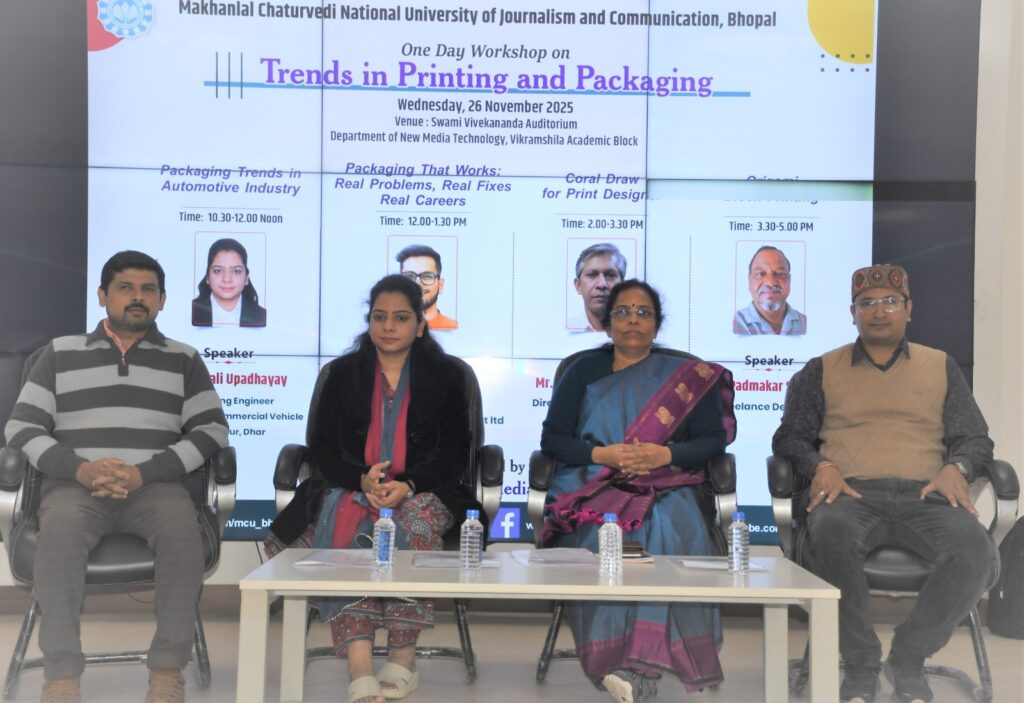 सीएनएन सेंट्रल न्यूज़ एंड नेटवर्क–आईटीडीसी इंडिया ईप्रेस /आईटीडीसी न्यूज़ भोपाल : माखनलाल चतुर्वेदी राष्ट्रीय पत्रकारिता एवं संचार विश्वविद्यालय, भोपाल के नवीन मीडिया प्रौद्योगिकी विभाग द्वारा स्वामी विवेकानंद सभागार में “ट्रेंड्स इन प्रिंटिंग एंड पैकेजिंग” विषय पर एक दिवसीय कार्यशाला का सफल आयोजन किया गया। इस कार्यक्रम का उद्देश्य विद्यार्थियों को विकसित हो रही प्रिंटिंग और पैकेजिंग इंडस्ट्री से जुड़े व्यावहारिक ज्ञान और उद्योग आधारित समझ प्रदान करना था।