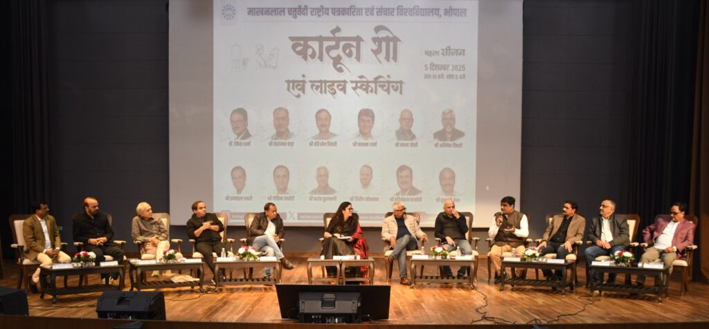 सीएनएन सेंट्रल न्यूज़ एंड नेटवर्क–आईटीडीसी इंडिया ईप्रेस /आईटीडीसी न्यूज़ भोपाल : अखबार का धड़कता हुआ दिल पन्नों पर दिखने वाली छोटी सी काठी नहीं, बल्कि वह तेज़, तीक्ष्ण और कभी-कभी दर्दनाक दृष्टि है जो हँसी के बहाने समाज को आईने में दिखाती है। राजधानी के इस अनूठे कार्टून कार्यक्रम में पेंसिलों ने शब्दों से भी ज़्यादा कुछ कह दिया। लाइव स्केचिंग, प्रदर्शनी और चर्चाओं ने यह प्रमाणित किया कि कार्टून केवल चुटकला नहीं, सोचने का माध्यम भी है। मंच पर हर रेखा में सवाल थे और हर हँसी के पीछे एक गहरी सीख नजर आ रही थी। यह नज़ारा था शुक्रवार को माखनलाल चतुर्वेदी राष्ट्रीय पत्रकारिता एवं संचार विश्वविद्यालय में आयोजित कार्टून शो, प्रदर्शनी और लाइव डिमॉन्सट्रेशन का।