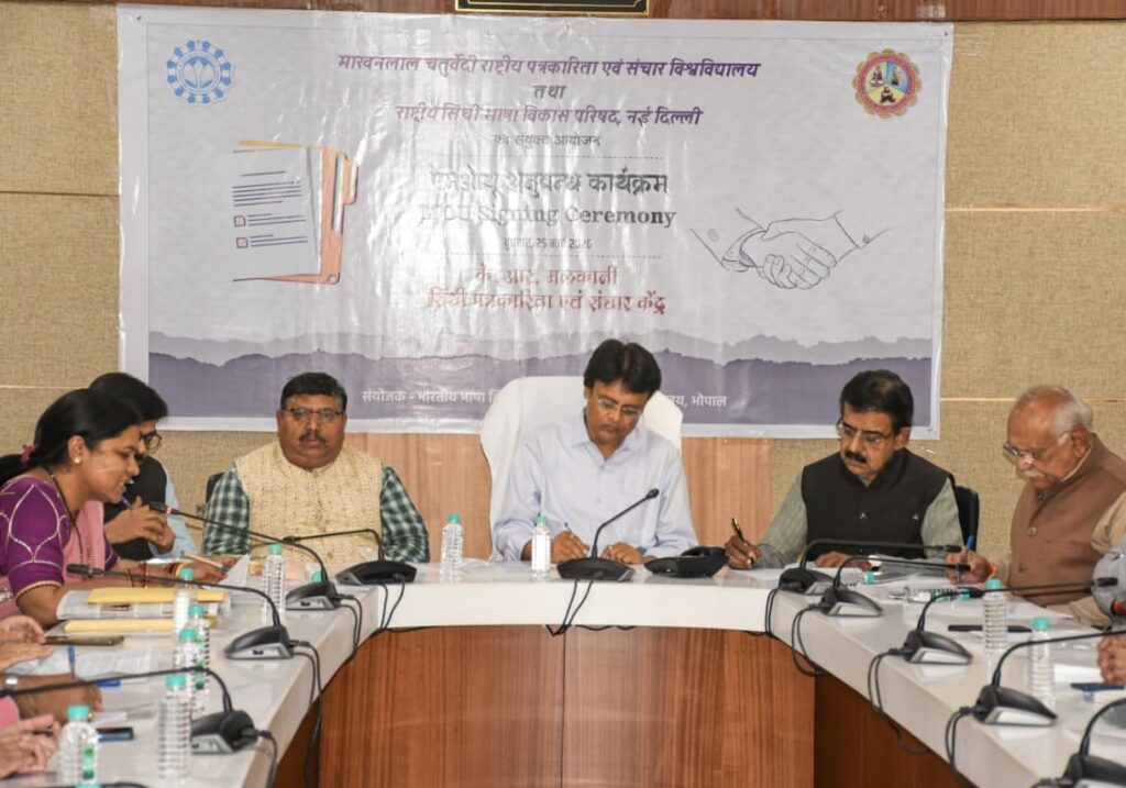 सीएनएन सेंट्रल न्यूज़ एंड नेटवर्क–आईटीडीसी इंडिया ईप्रेस /आईटीडीसी न्यूज़ भोपाल : माखनलाल चतुर्वेदी राष्ट्रीय पत्रकारिता विश्वविद्यालय (एमसीयू), भोपाल में के. आर. मलकानी सिंधी पत्रकारिता एवं संचार केंद्र के एमओयू अनुबंध कार्यक्रम का आयोजन भव्य रूप से किया गया। इस अवसर पर अतिथियों का स्वागत किया गया और केंद्र की संयोजक जया सुरजानी ने इस केंद्र और एमओयू की भूमिका के बारे में विस्तृत जानकारी दी। कार्यक्रम में कुलगुरु विजय मनोहर तिवारी ने कहा कि यह विश्वविद्यालय के लिए एक नई शुरुआत है। उन्होंने सिंध की संस्कृति, भाषा और पत्रकारिता के महत्व पर प्रकाश डालते हुए बताया कि यह केंद्र नई पीढ़ी को उनके इतिहास और सांस्कृतिक धरोहर से जोड़ने का काम करेगा। उन्होंने इंदौर में आयोजित सिंधु महोत्सव और द सिंध स्टोरी पुस्तक का उल्लेख करते हुए कहा कि विश्वविद्यालय में स्थापित यह केंद्र सिंधी समाज और संस्कृति के प्रसार में अहम भूमिका निभाएगा। राष्ट्रीय सिंधी भाषा विकास परिषद के अध्यक्ष सुनील बाबुराव कुलकर्णी ने कहा कि यह केंद्र सिंधी भाषा में पत्रकारिता और साहित्य के विकास के लिए महत्वपूर्ण है।