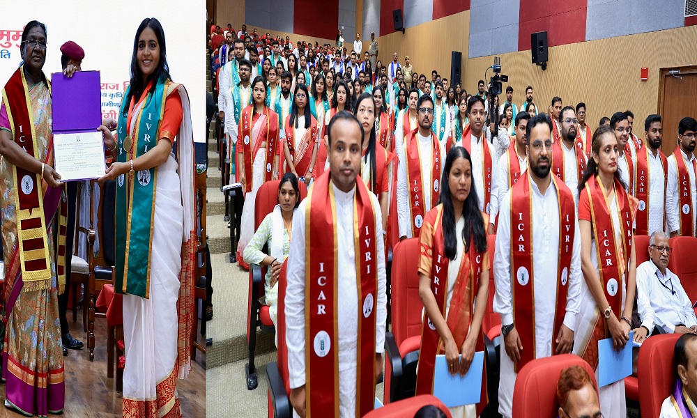 कोविड–19 के दौरान आईवीआरआई के योगदान को भी सराहा। राष्ट्रपति मुर्मू ने कहा कि टेक्नोलॉजी के उपयोग से पशु चिकित्सा क्षेत्र में क्रांतिकारी परिवर्तन संभव हैं। उन्होंने बेटियों की बढ़ती भागीदारी पर खुशी जताई और कहा कि यह पशु चिकित्सा क्षेत्र में सकारात्मक बदलाव का संकेत है। उन्होंने “वन हेल्थ” अवधारणा पर बल देते हुए मानव, पशु और पर्यावरण के बीच संतुलन बनाए रखने की आवश्यकता को रेखांकित किया। कार्यक्रम के अंत में राष्ट्रपति ने सभी छात्रों को शुभकामनाएं दीं और देश के लिए कार्य करने की प्रेरणा दी। यह समारोह पशु चिकित्सा शिक्षा, अनुसंधान और नवाचार के क्षेत्र में एक ऐतिहासिक क्षण बना।