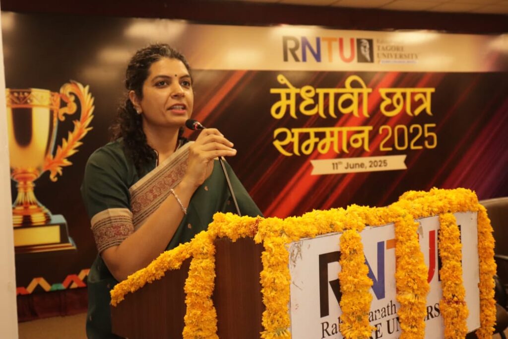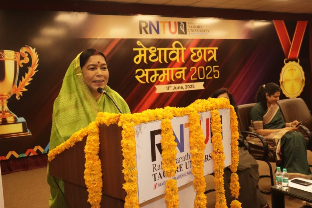 मेधावी छात्रों को संबोधित करते हुए डॉ. अदिति चतुर्वेदी वत्स ने अपने स्वागत भाषण में शिक्षा के माध्यम से समाज के उत्थान पर जोर दिया। उन्होंने आगे कहा कि शिक्षा केवल ज्ञान का माध्यम नहीं, बल्कि समाज के उत्थान का सशक्त उपकरण है। रबींद्रनाथ टैगोर विश्वविद्यालय विद्यार्थियों को कौशल और मूल्यों से समृद्ध बना रहा है। हमारी कोशिश है कि हर छात्र नवाचार, नेतृत्व और सामाजिक जिम्मेदारी में आगे बढ़े। मेधावी विद्यार्थियों की सफलता हम सभी के लिए गर्व का विषय है।