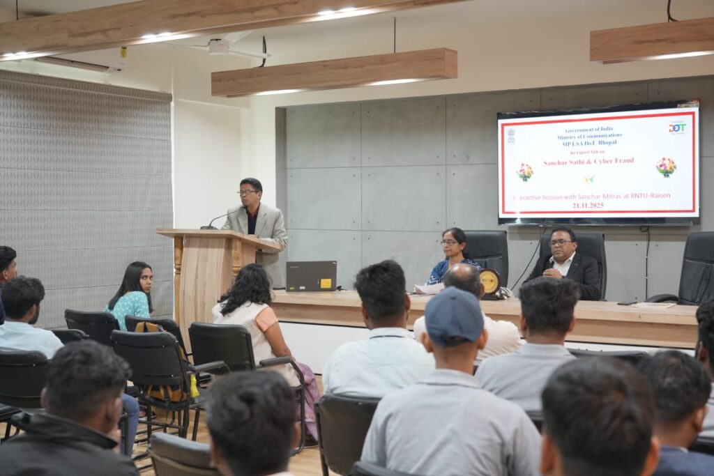 सीएनएन सेंट्रल न्यूज़ एंड नेटवर्क–आईटीडीसी इंडिया ईप्रेस /आईटीडीसी न्यूज़ भोपाल : रबींद्रनाथ टैगोर विश्वविद्यालय, रायसेन में दूरसंचार विभाग, एमपीएलएसए के सहयोग से “संचार साथी एवं साइबर धोखाधड़ी जागरूकता” विषय पर विशेष व्याख्यान कार्यक्रम का आयोजन किया गया। कार्यक्रम के मुख्य अतिथि दूरसंचार विभाग के डायरेक्टर टेक्नोलॉजी निलेश श्रीवास्तव रहे।