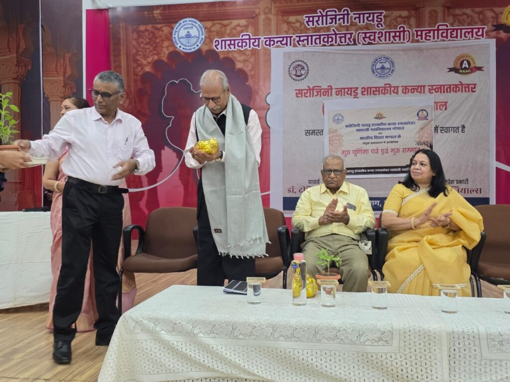 सीएनएन सेंट्रल न्यूज़ एंड नेटवर्क–आईटीडीसी इंडिया ईप्रेस / आईटीडीसी न्यूज़ भोपाल : सरोजिनी नायडू शासकीय स्वशासी कन्या खात्कोत्तर महाविद्यालय में भारतीय ज्ञान परपंग प्रकोष्ठ एवं भारतीय शिक्षण मंडल के तत्वावधान में गुरू पूर्णिमा एवं गुरू सम्मान पर्व उत्साह पूर्वक मनाया गया। इस पावन अवसर पर मुख्य अतिथि के रूप में डॉ. विनोद शुक्ला (सेवानिवृत प्राध्यापक एवं पूर्व अतिरिक्त संचालक उच्च शिक्षा) एवं मुख्य अतिथि के रूप में डॉ. राधावल्लभ शर्मा (पूर्व अतिरिक्त संचालक उच्च शिक्षा) आमंत्रित थे। मां सरस्वती को दीप प्रज्जवलन एवं विष्णु पुराण के “ध्येय वाक्य” से कार्यक्रम का शुभारंभ किया गया। इस अवसर महाविद्याल की छात्रा तान्या शर्मा ने गुरु वंदना प्रस्तुत की। अतिथियों द्वारा सरस्वती प्रतिमा एवं वेद बांग्मय पर पुष्पाजंलि के द्वारा कार्यक्रम का भव्य आरंभ हुआ। मुख्य अतिथि एवं प्रमुख वक्ता जो गुरू के रूप में ज्ञान का प्रकाश फैला रहे है, उनका शॉल, श्रीफल से स्वागत किया गया।