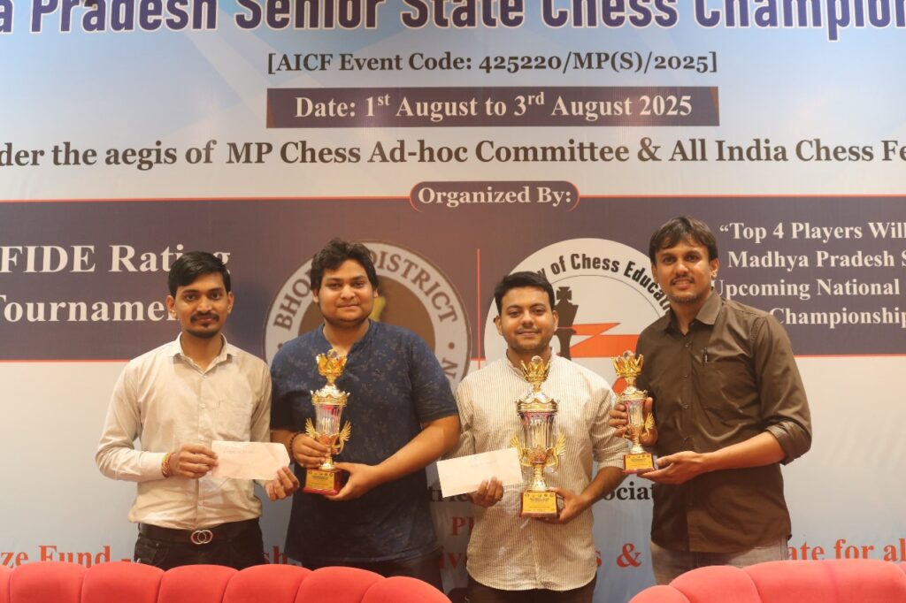 सीएनएन सेंट्रल न्यूज़ एंड नेटवर्क – आईटीडीसी इंडिया ईप्रेस / आईटीडीसी न्यूज़ भोपाल : भोपाल में आयोजित मध्यप्रदेश राज्य ओपन शतरंज प्रतियोगिता का अंतिम दिन नाटकीय मुकाबलों और भव्य पुरस्कार वितरण समारोह के साथ संपन्न हुआ। पूरे प्रदेश के 300 से अधिक खिलाड़ियों की भागीदारी से इस प्रतियोगिता ने एक नया कीर्तिमान स्थापित किया। प्रमुख अतिथियों की गरिमामयी उपस्थिति समापन समारोह में विशिष्ट अतिथियों के रूप में शामिल हुए: निदेशक ऋषि कुमार शुक्ला (पूर्व निदेशक, सीबीआई, भारत सरकार), अभिषेक सिंह चौहान (निदेशक, भारतीय खेल प्राधिकरण भोपाल), सिबी चक्रवर्ती (प्रबंध निदेशक, म.प्र. बिल्डिंग डेवलपमेंट कॉर्पोरेशन), एस.एन. रूपला (पूर्व आईएएस अधिकारी), गुरमीत सिंह (अध्यक्ष, म.प्र. एधॉक समिति), कपिल सक्सेना (प्रतियोगिता निदेशक एवं अंतरराष्ट्रीय शतरंज खिलाड़ी), आईए अनुराग सिंह (मुख्य निर्णायक)| इन सभी गणमान्य व्यक्तियों ने विजेताओं को ट्रॉफी एवं नकद पुरस्कार प्रदान किए।