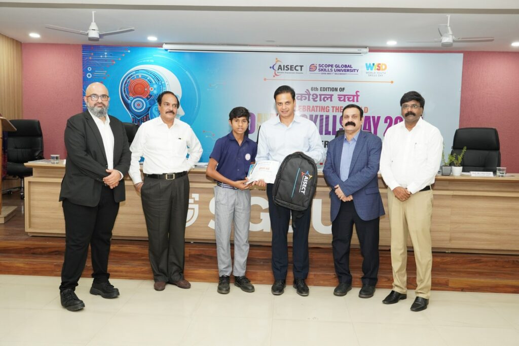 सीएनएन सेंट्रल न्यूज़ एंड नेटवर्क–आईटीडीसी इंडिया ईप्रेस / आईटीडीसी न्यूज़ भोपाल : स्कोप ग्लोबल स्किल्स यूनिवर्सिटी (एसजीएसयू) एवं आईसेक्ट के संयुक्त तत्वावधान में वर्ल्ड यूथ स्किल्स डे के अवसर पर फ्लैगशिप कार्यक्रम “कौशल चर्चा” का आयोजन किया गया। इस अवसर पर उद्योग, शिक्षा और एआई के क्षेत्र से प्रतिष्ठित व्यक्तित्वों ने शिरकत की जिसमें मुख्य अतिथि पीएसएससीआईवी के करिकुलम डेवलपमेंट एंड इवेलुएशन सेंटर के हैड निदेशक वीएस मेहरोत्रा, मुख्य वक्ता आईपी एंड एनेलिटिक्स कंसल्टिंग के एक्जीक्यूटिव वाइस प्रेसिडेंट एंड ग्लोबल हैड ऑफ इनोवेशन अनीस मर्चेंट एवं मैपसेट के जनरल मैनेजर एसके पाराशर और डाटाट्रेक के सीईओ आशीष कोलारकर उपस्थित रहे। उनके साथ मंच पर एसजीएसयू के चांसलर सिद्धार्थ चतुर्वेदी एवं कुलगुरू विजय सिंह उपस्थित रहे। अन्य प्रमुखों में एसजीएसयू के कुलसचिव सितेश कुमार सिन्हा एवं आईसेक्ट के जनरल मैनेजर अभिषेक गुप्ता भी प्रमुख रूप से उपस्थित रहे।