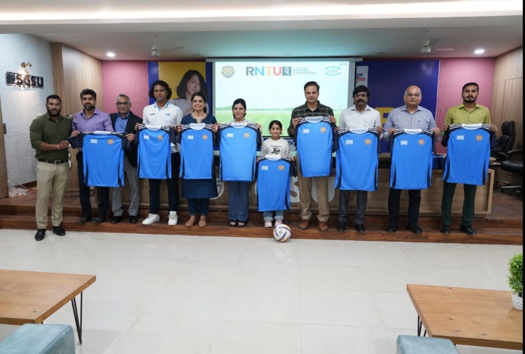 सीएनएन सेंट्रल न्यूज़ एंड नेटवर्क – आईटीडीसी इंडिया ईप्रेस / आईटीडीसी न्यूज़ भोपाल : रबीन्द्रनाथ टैगोर विश्वविद्यालय भोपाल ने विश्व के बड़े फुटबॉल क्लब में शुमार इंडिया रश सॉकर क्लब के साथ एक एमओयू कर प्रदेश में फुटबॉल के क्षेत्र में खिलाड़ियों को टैगोर फुटबॉल क्लब के रूप में नया प्लेटफॉर्म स्थापित किया है। यह रणनीतिक सहयोग एक समझौता ज्ञापन (एमओयू) पर हस्ताक्षर कर औपचारिक रूप से संपन्न हुआ। विश्वविद्यालय की रजिस्ट्रार डॉ संगीता जौहरी और इंडिया रश सॉकर क्लब के सीईओ डेनिस फर्नांडीस ने ऐतिहासिक एमओयू पर हस्ताक्षर किए। एमओयू हस्ताक्षर समारोह के उपरांत टैगोर फुटबॉल क्लब की टीम के जर्सी का अनावरण किया गया। इस अवसर पर आईसेक्ट समूह के कार्यकारी उपाध्यक्ष और स्कोप ग्लोबल स्किल्स यूनिवर्सिटी के चांसलर सिद्धार्थ चतुर्वेदी, आरएनटीयू की प्रो-चांसलर अदिति चतुर्वेदी वत्स, रजिस्ट्रार संगीता जौहरी, एसजीएसयू के कुलगुरु विजय सिंह, कुलसचिव सितेश सिन्हा और इंडिया रश सॉकर क्लब के सीईओ डेनिस फर्नांडीस ने संयुक्त रूप से टी-शर्ट का अनावरण किया।